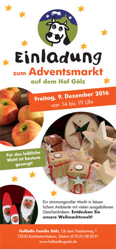 Immer am Freitag vor dem dritten Advent zeigt sich der Bauernhof von Familie Gölz von der weihnachtlichen Seite: Im Schuppen und auf dem Hof findet von 14 Uhr bis 19 Uhr der stimmungsvolle Adventsmarkt statt. Liebevoll dekorierte Stände zeigen ihr kreatives Angebot an ausgefallenem Kunsthandwerk, Geschenkideen und weihnachtlichen Accessoires.